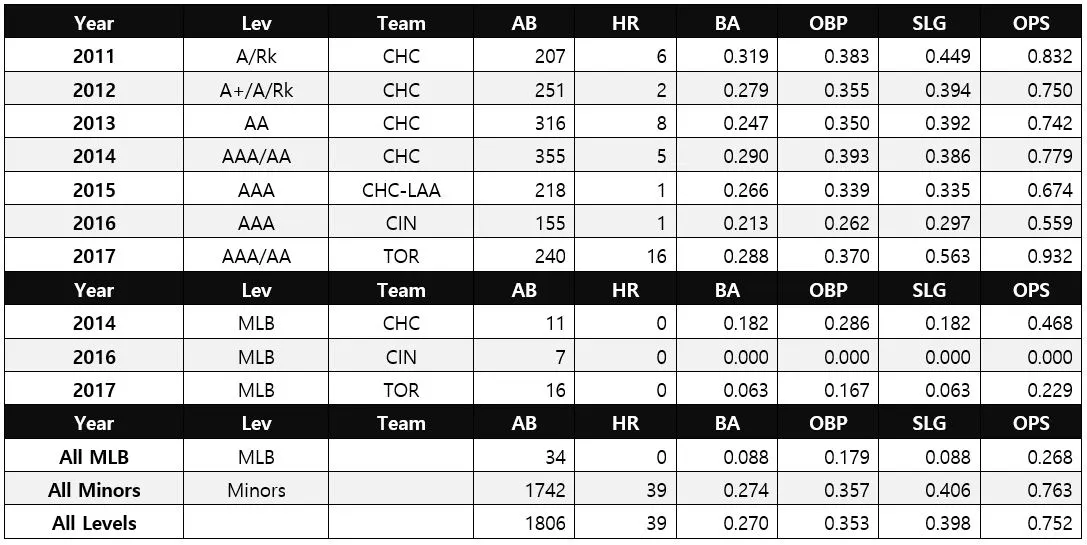 컵스에 지명된 이후에도, 그는 좀처럼 빅리그 무대를 밟지 못했다. 2015시즌 중반 LA 에인절스로 트레이드되기 전까지 4년반이라는 시간동안, 그는 메이저리그에서 단지 7게임 밖에 뛰지 못했다. 주어진 14번의 타석에서 11타수 2안타 0.182/0.286/0.182의 성적을 기록한 그는, 신시네티 레즈로 트레이드되어 빅리그에 서기까지 다시 2년을 기다려야 했다.