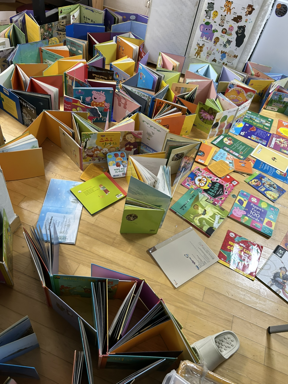 집을 짓고 계셨다. 지금 짓는 중이라며 방에서 나오지 말고 기다리라고.. 거의 한 시간이 지났지만 집은 아무짓고 집 지릉 재료인 책만 저렇게…