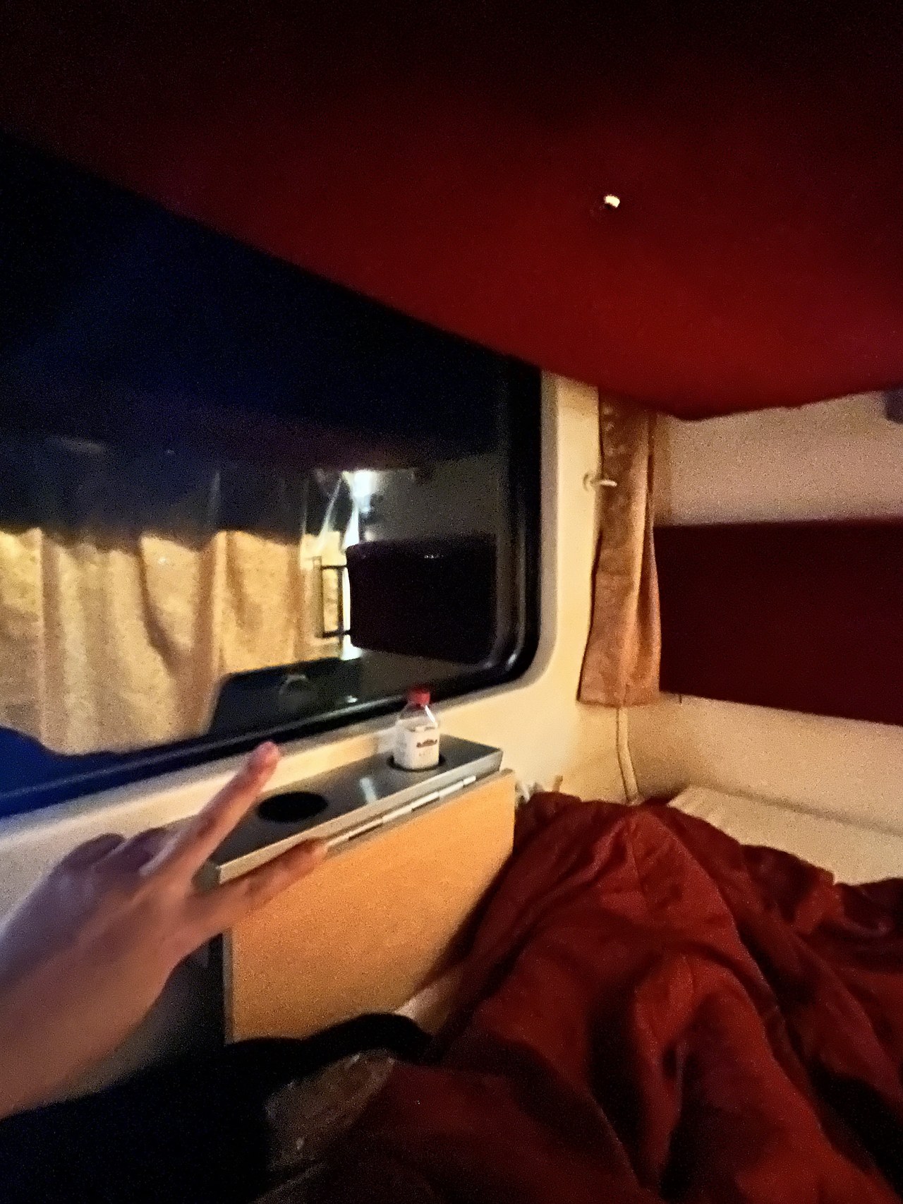 기차 안 작은 침대 위, 창밖으로 스쳐가는 풍경을 바라보며,