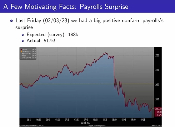 비농업고용지수(Nonfarm Payrolls)는 농축산업을 제외한 전월 고용인구수 변화를 측정합니다. 예상치가 188k이고 실제는 517k으로 일자리창출이 그만큼 많이 되었다는 좋은 소식인데 해당 지표가 발표되자마자 미국 증시는 급락한다. (교수는 얼른 설명하고 싶으신 지 학생들에게 왜 이런 걸까 질문을 하면서 웃으신다.) 위에서 설명했듯이 각종 지표들에서 경기가 과열돼서 물가가 빠르게 올라가고 있는 데 고용이 더 늘어났다는 말은 앞으로 노동시장이 더 과열될 걸로 예상되고 그렇다면 Fed는 추가적인 금리인상 등 더 강력한 재정정책을 펼칠 것이기 때문이다.