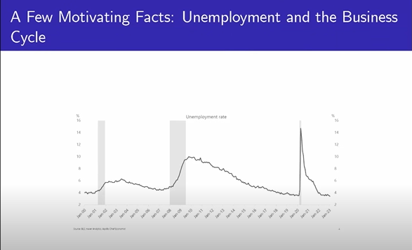Unemployment rate 은 경기침체가 올 때마다 치솟는 것을 보여준다.