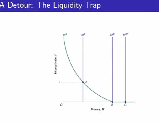 다만, 확장적재정정책은 한계에 부딫일 수 있다. 금리를 0으로 낮추게 되면 아무리 통화공급을 많이 해도 더이상 통화가 시중에 유통되지않는다. 시중은행이 돈을 갖고 있는 것이나 bond를 들고 있는 것이나 차이가 없기 때문에 OMO가 효과적으로 이루어지지 않는다. 대표적인 사례가 일본이 긴 시간동안 유지해오던 0% 금리 정책이다.