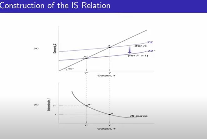 따라서, 위 그래프로 IS는 설명할 수 있다. (Savings)수요와 공급은 같으니 45%도로 직선을 표현하고 있고 (Investment) ZZ 곡선은 이자율 변동에 따른 투자의 변동을 나타낸다. 두 선의 균형점들이 모여서 만들어지는 곡선이 아래의 IS 모델이다.
