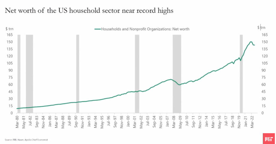 1. 2008~2009년 서브프라임 모기지 사태로 인하여 경제가 타격받은 이후 미국은 주식가치 상승 및 집값상승으로 미국가정의 순자산이 지속적으로 증가하였다. 다만 기억하듯이 2022년에 미국증시가 크게 빠지면서 크래프의 꼬리가 살짝 눌리는 게 보이기도 한다.