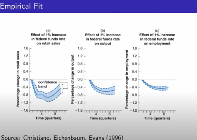1%의 정책금리를 올렸을 때 각종 경제지표에 영향을 끼치는 데 걸리는 기간을 실증연구를 한 결과를 보았을 대 대략적으로 6개의 분기 (1년 6개월) 이 지나야지 경제에 통화정책이 얼마나 효과가 있었는 지 가늠이 가능한 것으로 보인다.
