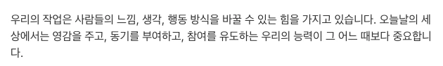 특히 회사 교육에서 임원들이 나와 부당함은 계속해서 말하고, 우리 모두 존중받을 가치가 있다고 계속 말해주는 게 너무 좋았다. 그리고 대표님이 우리는 세상에 영감을 주며, 동기를 부여하는 일에 기여한다고 해주는 게 좋았다. 내가 하고 싶은 일이니까. 지금 좋았던 점들을 잊지 않고 마음속에 꼭 안고, 오래가보고 싶다. 이젠 앤디처럼 모든 시간을 회사에 받칠 열정은 없지만, 잔잔하게 얇고 길게 간다는 생각으로 가보고 싶다. 지금의 나에게 <악마는 프라다를 입는다>라는 영화가 눈에 띄어줘서 고맙다.