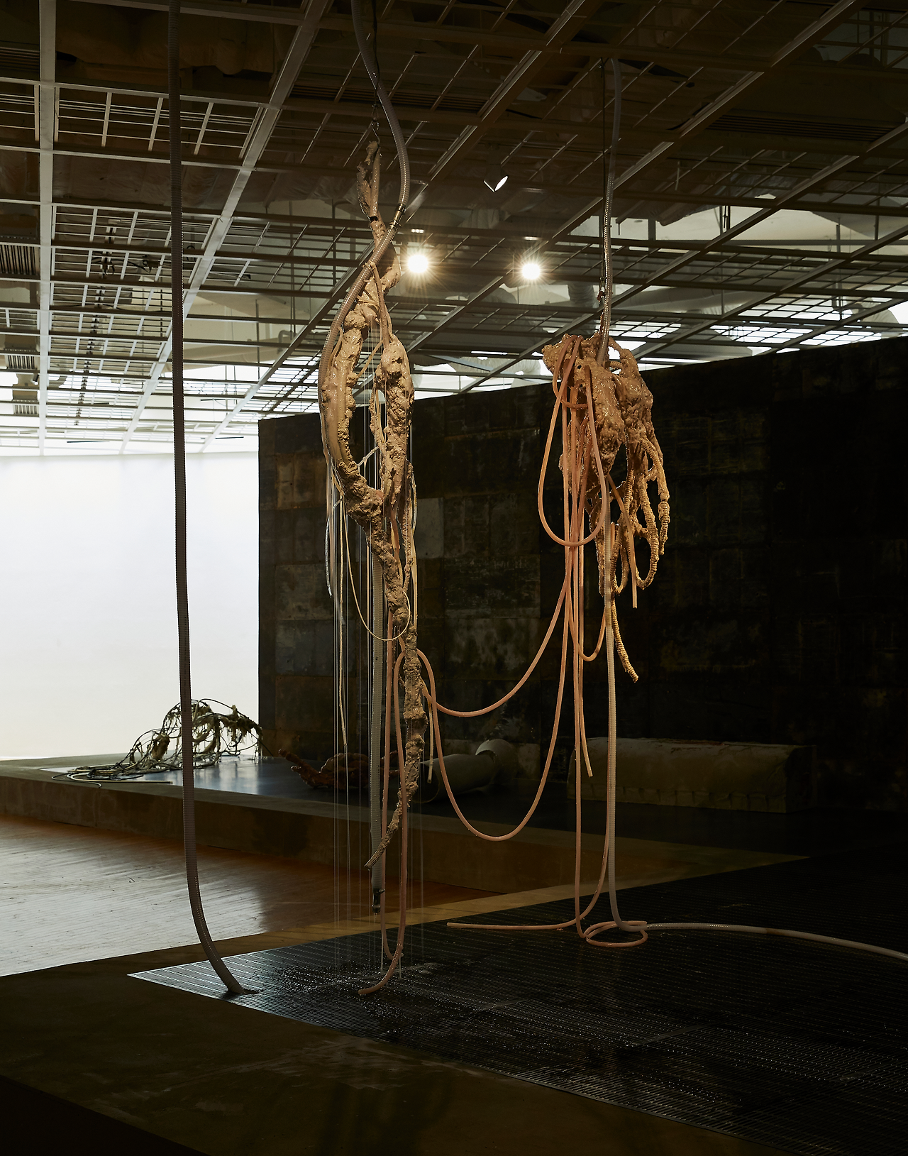 그 모든 소리의 원천은 작품을 이루는 것들 중 가장 연약한 물질들, 유체로부터 시작된다. 관과 호스를 타고 뿜어지기도, 추락하기도, 빨아들여지기도 하는 동안 점액질의 물질 속으로 필연적으로 유입되는 공기이다. 공기는 <캐리어즈>라 이름 붙은 어떤 생물의 내장을 닮은 호스 속을 흐르는 점액 물질 속으로 침입하여 작가가 의도하지 못한 방식으로 잡음을 만든다. 끈끈한 점액질들의 소리 없는 흐름을 거칠게 단절시키며 자신의 극적인 분출을 알리듯이.
