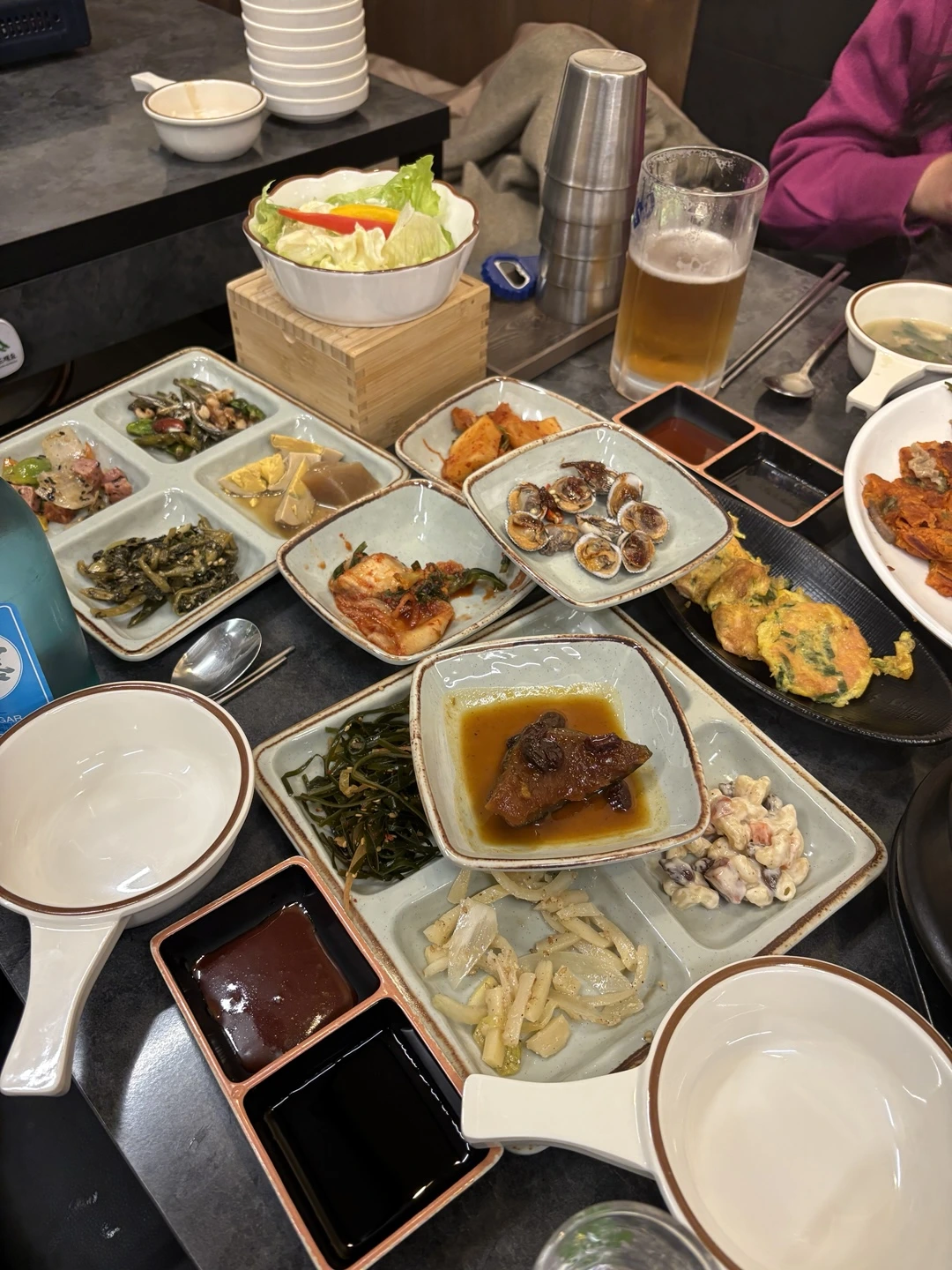 이 집이 특별한 점은 비단 '맛'때문은 아닌데, 우선 앞에서도 서술했듯이 12종이 넘는 밑반찬을 제공한다. 밑반찬은 그날 그날 사장님의 기분이나 재료의 수급 따라 조금씩 다르게 서브되는 것 같은데, 각종 나물과 전, 볶음 무침류, 샐러드 등 거의 한식뷔페를 방불케 하는 라인업이 결코 작은 크기가 아닌 탁자에 넘쳐난다.