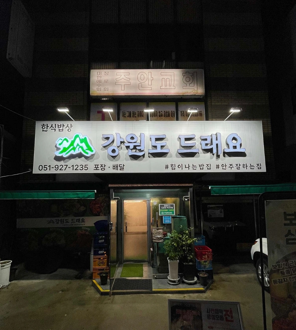 어느 날 내가 좋아하는 부산 맛집 인플루언서께서 동래구 명륜동 근처에 12종의 밑반찬과 끝내주는 메뉴들이 있다며 작성하신 글을 보고는 호기심이 생겼다. 우리의 속칭 나와바리 구역에 위치한 맛집 리스트에는 없었던 새로 등장한 식당이었으며 주력메뉴가 경상도 사람들에게는 다소 생소한 강원도 음식이라는 점이 신선하게 다가왔기 때문에 부산에 방문했을 때 친하게 지내는 언니들과 함께 주저하지 않고 방문했다.