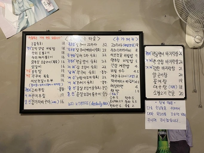 이 집은 횟집도, '해물'만을 주력으로 하는 식당도 아니다. 메뉴판을 보면 어마어마한 숫자의 메뉴들이 빼곡하게 적혀있는 것도 모자라 추가 메뉴까지 구비되어 있고, 처음 방문한 사람들은 여기서부터 어지럼증을 느낄 수 있으니 조심해야 한다.
