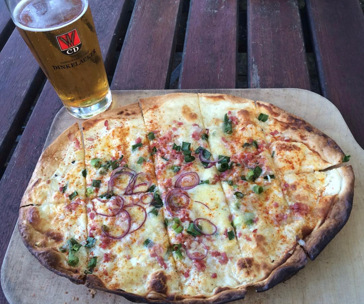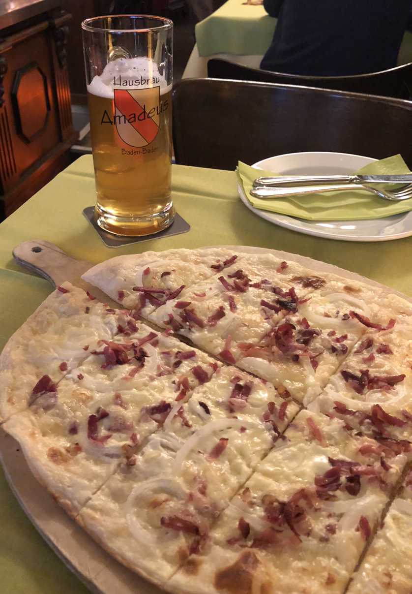 독일에서 슈투트가르트 토박이인 학교 친구의 손에 이끌려 올라간 언덕 위에 비어가르텐(Biergarten)이 있었다. 그곳에서는 슈투트가르트 전체를 조망할 수 있는 멋진 뷰를 감상할 수 있었고 지역의 대표 브루어리에서 양조한 맥주와 맛있는 전통음식을 판매하고 있었다. 위 사진의 플람쿠헨은 특이하게 덜 익은 파와 적양파가 가득 올려져 있어 매운맛이 아주 강했다. 하지만 가장 흔한 오리지널 또는 독일인들이 부르는 대로라면 ‘클래식 플람쿠헨(klassisch)’은 아래 사진처럼 생겼다.