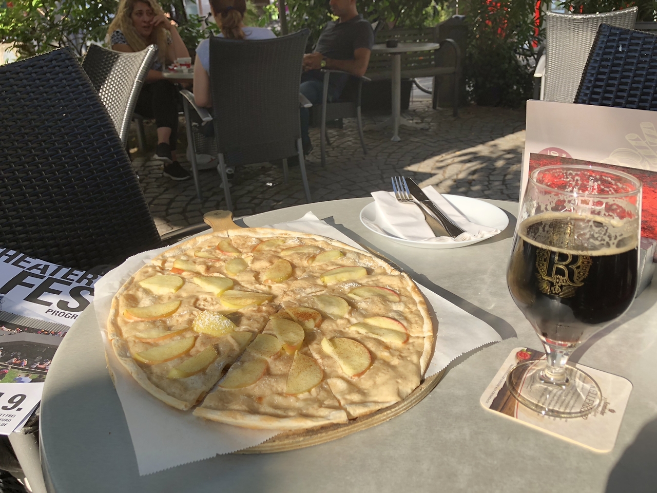 독일에서 단 한 번 식사용이 아닌 디저트용 애플시나몬 플람쿠헨을 주문하는 모험을 해 봤다. 보통은 독일에서 외식을 할 때 모험 따위는 하지 않지만 이 브루어리는 구글 별점이 아주 높은데 리뷰한 사람 수도 많고 축제가 열리는 주말이었는데도 꽤 붐비고 있는 데다 플람쿠헨의 고향 지역이기도 해 특이한 메뉴를 시도해 봤는데 그 브루어리에서 직접 양조한 흑맥주와 함께 아주 만족스러운 식사를 하고 왔다. 그런데 저런 조합으로 주문하는 사람은 없는 건지 주문을 받는 분이 „Sie sind sicher???(확실해요???)”라고 여러 번 되물었다.