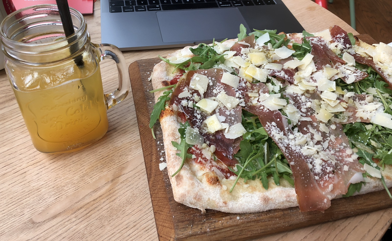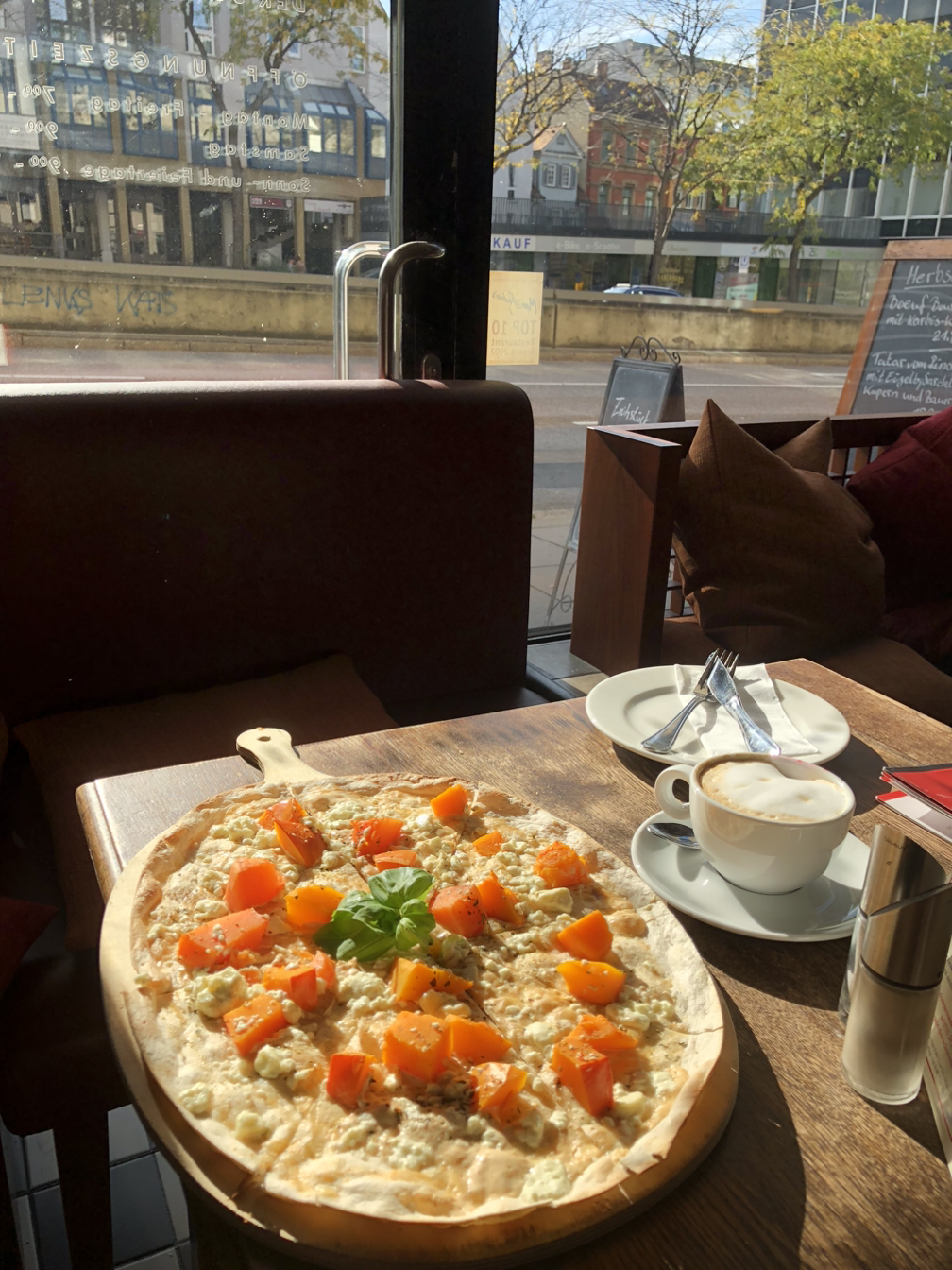 사진의 플람쿠헨이 너무 맛있어서 근접샷을 남겨왔다. 바짝 구웠지만 드물게도 어느 곳도 타지 않은 얇은 도우 위 듬뿍 올린 사워크림과 쭉 늘어나는 치즈, 잘게 썰어 적당히 익은 양파와 베이컨까지 완벽한 조합이었다.