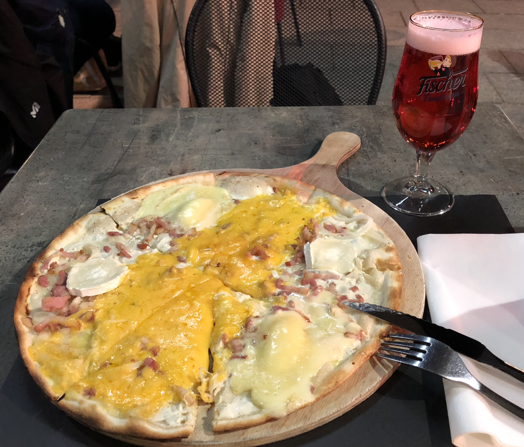 이 지역의 프랑스인들은 플람베의 기원을 두고 지역감정과 국가 간 감정까지 더해 자존심을 건 승부를 벌이고 있는데 지역의 많은 레스토랑은 ‘플람베의 원조 스트라스부르에서 먹는 정통 플람베의 맛!’같은 구호를 내걸고 마케팅을 한다. 그리고 이 지역이 고향인 프랑스인에게 플람쿠헨이 독일 음식이라고 하면 플람베라고 고쳐주며 작은 싸움이 날 수도 있기 때문에 그러지 않는 것이 좋다. 대체적으로 프랑스의 플람베는 독일보다 크림은 적게 쓰면서 치즈를 풍부하게 쓰는 경향이 있어 개인적으로는 이쪽이 더 좋았지만 프랑스와 독일 모두에 속하지 않는 외국인의 입장에서는 다양한 버전의 플람쿠헨을 맛볼 수 있어 좋았다.
