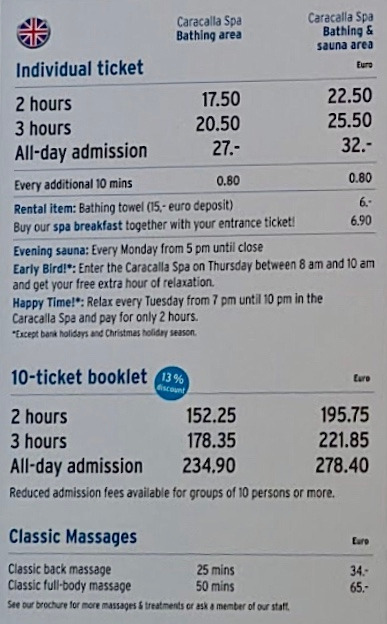 온천 안에는 이렇게 레스토랑도 있는데 온천에 입장할 때 받은 카드키로 결제하고 집에 갈 때 로비 매표소에서 계산하면 된다. 바로 윗층에는 온천에서 계단을 통해 밖으로 나가지 않고 바로 올라갈 수 있는 사우나가 있는데 문 앞에서 대충 보기로는 건식, 습식을 포함해 방이 다섯 개 정도 있는 것 같았지만 수영복을 입고 수건으로 몸을 감싸고 있다는 이유로 사우나가 있는 층의 출입을 금지당했다. 남녀노소 가릴 것 없이 수건으로 몸을 감싸지도 않고 다 벗은 상태로 함께 사우나를 즐기는 게 독일의 문화니 이렇게 다 가린 상태로는 들어올 수 없다는 게 사우나 층 직원의 설명이었다. 내가 지불한 입장료에 사우나까지 포함되어 있다는 것이 뼈아팠지만 더 잘 알아보고 가지 않은 데 대한 멍청비용을 지불한 셈 치고 사우나를 포기하기로 했다.