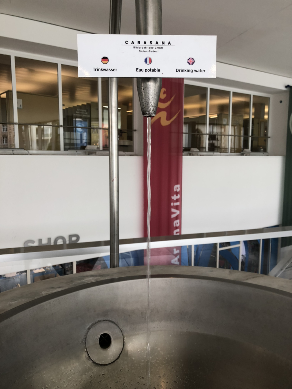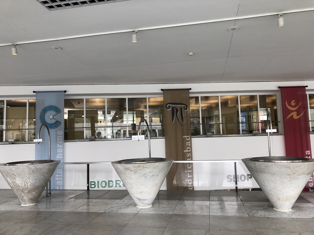 다 씻고 나와서 로비에서 수건을 반납하고 온천을 떠날 때 마지막으로 신선한 온천수로 물병을 채워 가라는 의미로 로비에 이 수도꼭지가 있다. 나는 마시지 않았지만 내 앞에 있던 영국 노부부 일행은 제각기 서서 손으로 물을 받아 마시고 있었다.