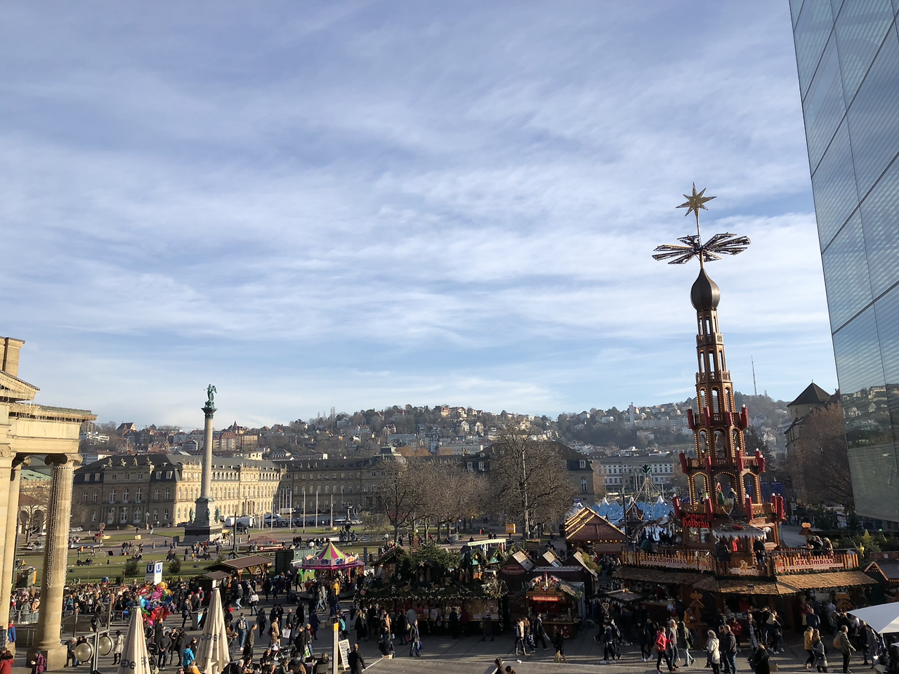 신년 맞이 축제와 크리스마스 마켓, 맥주 축제 등 슈투트가르트의 온갖 행사가 열리는 슐로스플라츠의 겨울 낮 풍경이다. 사진 속 모습은 바로 슈투트가르트의 크리스마스 마켓인데 아직도 2022년 크리스마스가 지나갔다는 것이 실감나지 않는다.