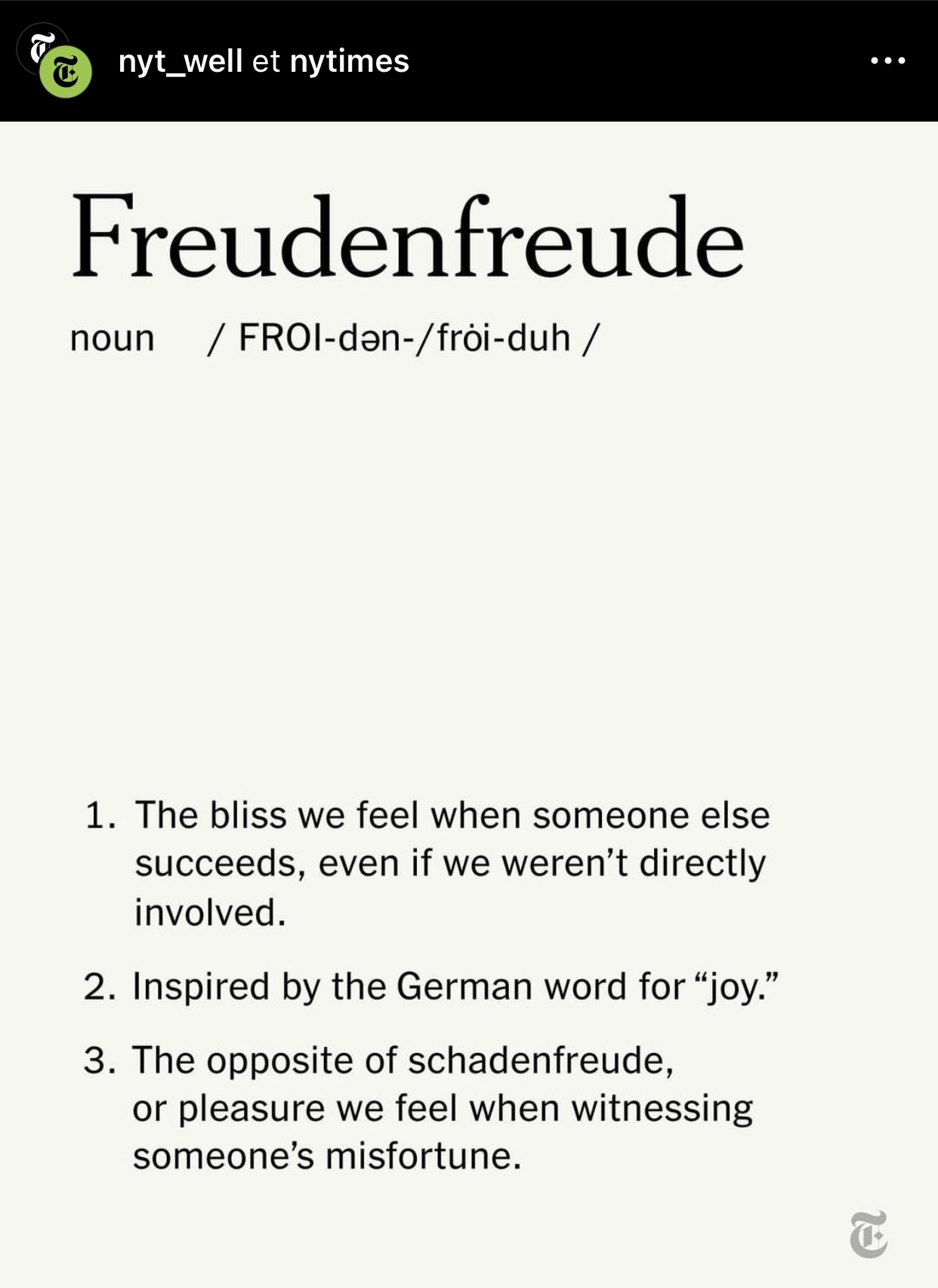 그런데 최근에는 뉴욕타임즈에 이런 샤덴프로이데 정서를 비판하며 우리 자신의 행복을 위해서는 샤덴프로이데 대신 프로이덴프로이데(Freudenfreude)의 정서를 가꾸어야 한다는 요지의 기사도 등장했다!