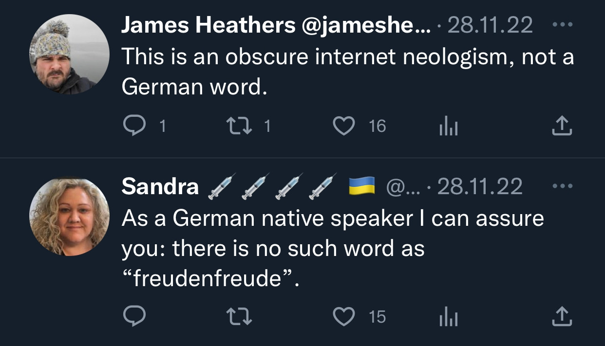 뉴욕타임즈가 자신 있게 주장하는 바와는 달리 트위터의 독일인들은 프로이덴프로이데라는 단어가 독일어에 존재하지 않는다고 한다.