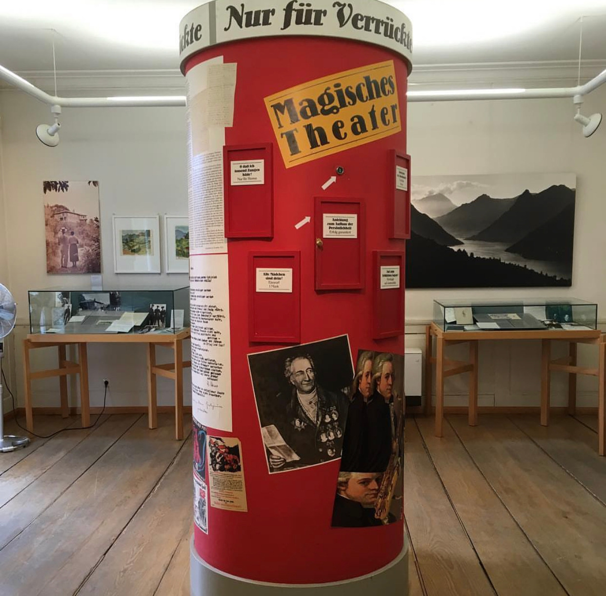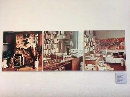저 방에는 헤르만 헤세의 연대기와 사용했던 타자기, 출판사에서 원고를 수정하기 전 가장 첫 완성본, 헤세가 살았던 곳에서 그린 그림 등이 전시되어 있어 즐겁게 봤다. 위 사진 속 왼쪽 벽면에 걸려 있는 그림은 인도네시아에 살고 있던 헤세를 방문한 지인 중 어느 화가가 그린 헤세 부부와 인도네시아의 풍경이고 오른쪽 벽면의 사진은 헤세가 인도네시아에서 직접 찍었다.