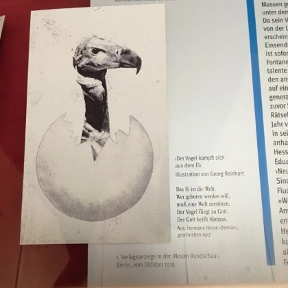 헤세의 소설 «데미안»에서 가장 인기있는 구절 ‘새는 알에서 깨어나기 위해 투쟁한다’와 그 삽화다. 헤세가 소설을 써내려가며 이 심상을 구체화하기 위해 그림을 직접 그렸다고 한다.