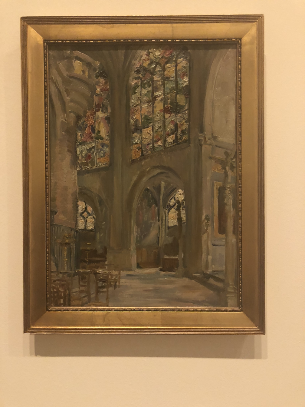 이 그림에서 스테인드글라스를 표현한 방식이 신기했다. 똑같이 성당의 스테인드글라스를 그린 샤갈의 그림에서는 스테인드글라스의 모양이 단순화되긴 했어도 빛뭉치로 표현하지는 않는데 여기에서는 과감하게 스테인드글라스의 디테일을 생략한 대신 성당의 내부 묘사에 좀 더 중점을 둔 느낌이다.