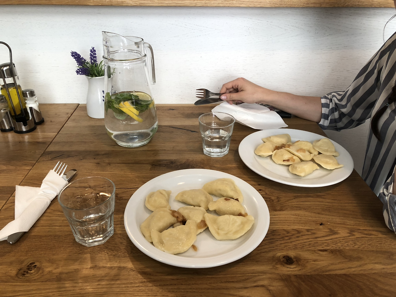 다음 날 아침식사로 친구가 추천하는 폴란드 전통음식인 감자가 든 만두, 피에로기를 먹었다. 폴란드는 맥주로 유명하지만 아쉽게도 친구는 주류를 혐오하는 사람이라 나에게 뭐라 하지는 않아도 맥주를 주문하는 게 눈치가 보여 물을 마셨다.