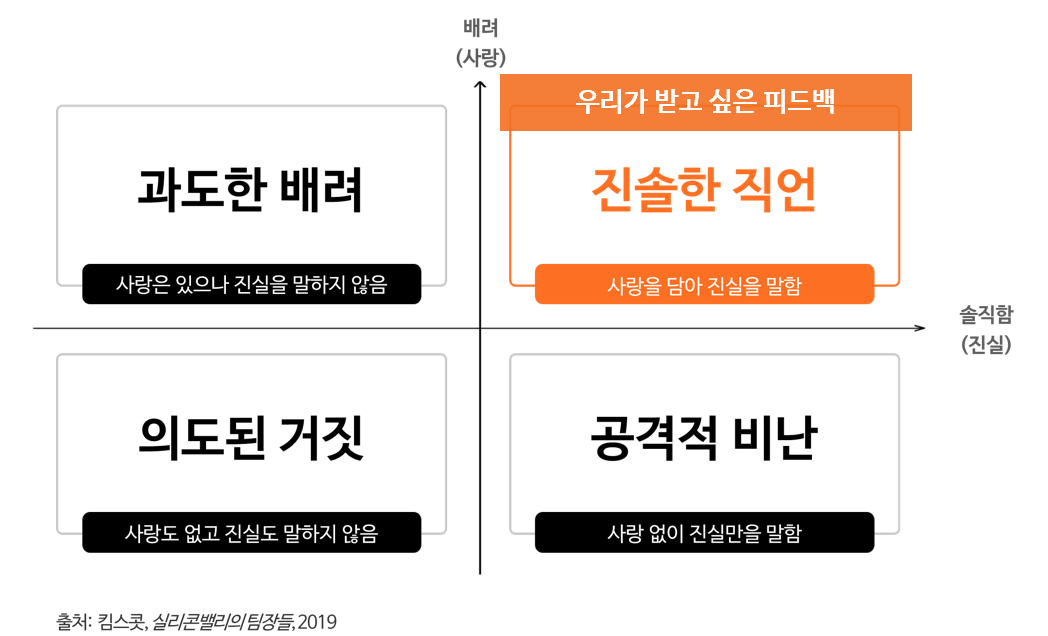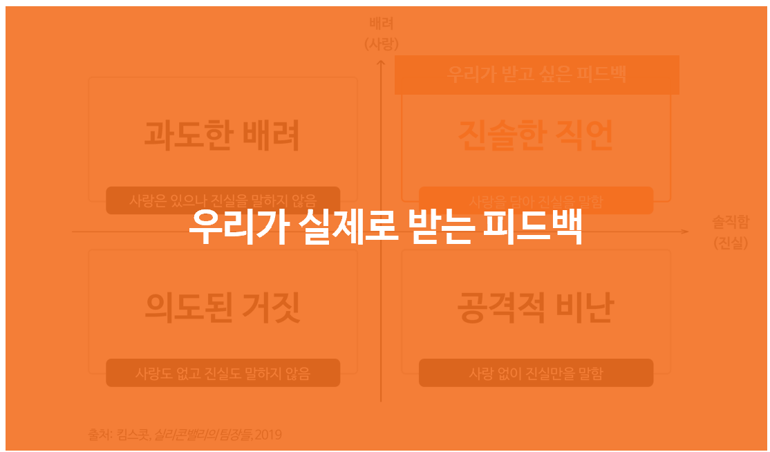 지난 글에서 살펴보았던 피드백의 네 가지 유형이다. 네 가지 유형 중 우리가 추구해야할 피드백의 모습이 사랑을 담아 진실을 말하는 '진솔한 직언'이라고 살펴봤었다. 그리고 사실 우리가 그렇게나 '받고 싶은' 피드백의 모습도 바로 이 '진솔한 직언'일 것이다. 하지만 실제로는 어떨까? 우리가 실제 현실에서 받는 피드백의 모습들은 어떤지 생각 해 볼 필요가 있다.