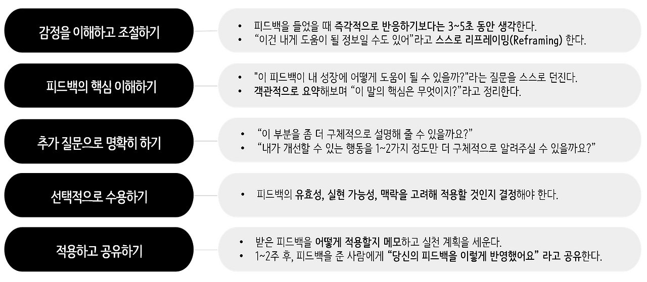 위 내용들을 정리하며 쉽지 않은 피드백을 들었을 때 그것을 오히려 성장의 기회로 만들기 위한 몇 가지 방법을 제안한다.