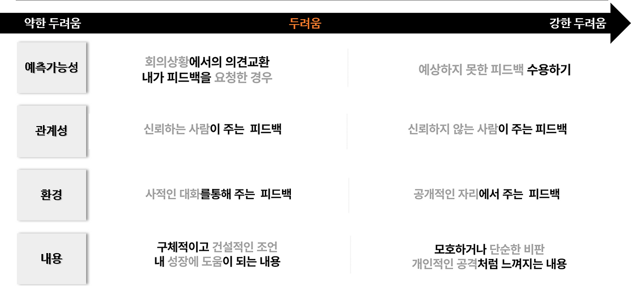 실제로, 피드백을 받을 때 두려움이 증가하고 수용하기가 특별히 더 어려운 상황들이 존재한다. 이것은 개인의 문제라기 보다 누구나 느끼는 감정이라는 점을 이해하는 것이 중요하다. 두려움의 정도로 봤을 때, 예측이 가능한 상황에서 신뢰하는 사람이 사적으로 주는 구체적이고 건설적인 피드백은 크게 두려움없이 받아들이기가 쉽다. 하지만 그 반대의 경우(예상치 못한 상황에서 신뢰하지 않는 사람이 공개적으로 비판하는 내용의 피드백)에는 수용성이 낮아질 수 밖에 없고, 이런 피드백을 받는 것은 누구에게나 두렵고 어려운 일이다.