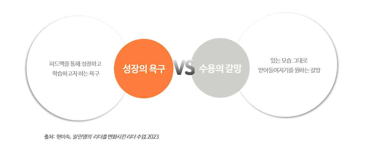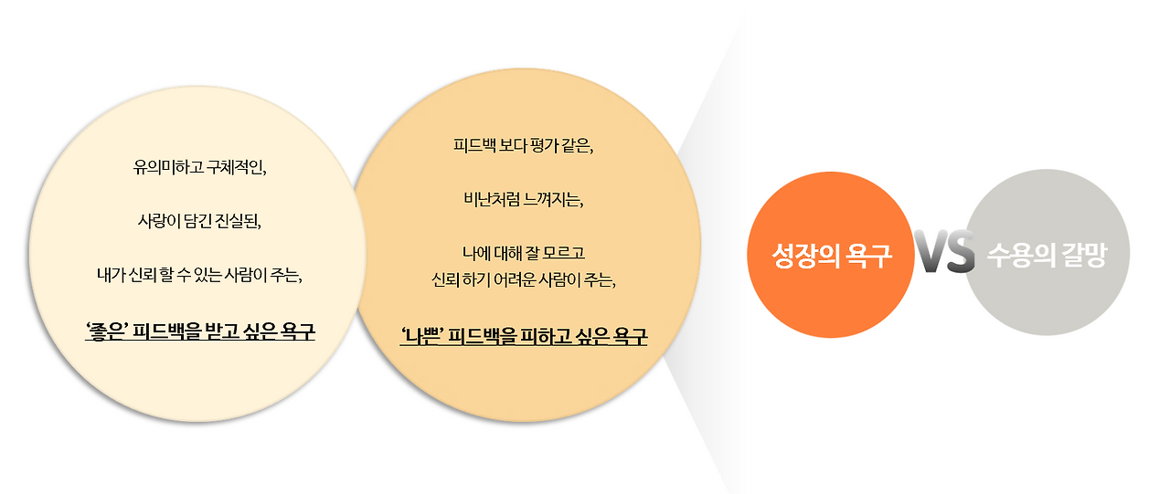 앞서 설명했듯 인간에게는 피드백을 대하는 모순된 이중감정이 있다. 이 때 수용의 갈망보다 성장의 욕구를 선택하는 것이 필요하다는 것도 살펴봤다.