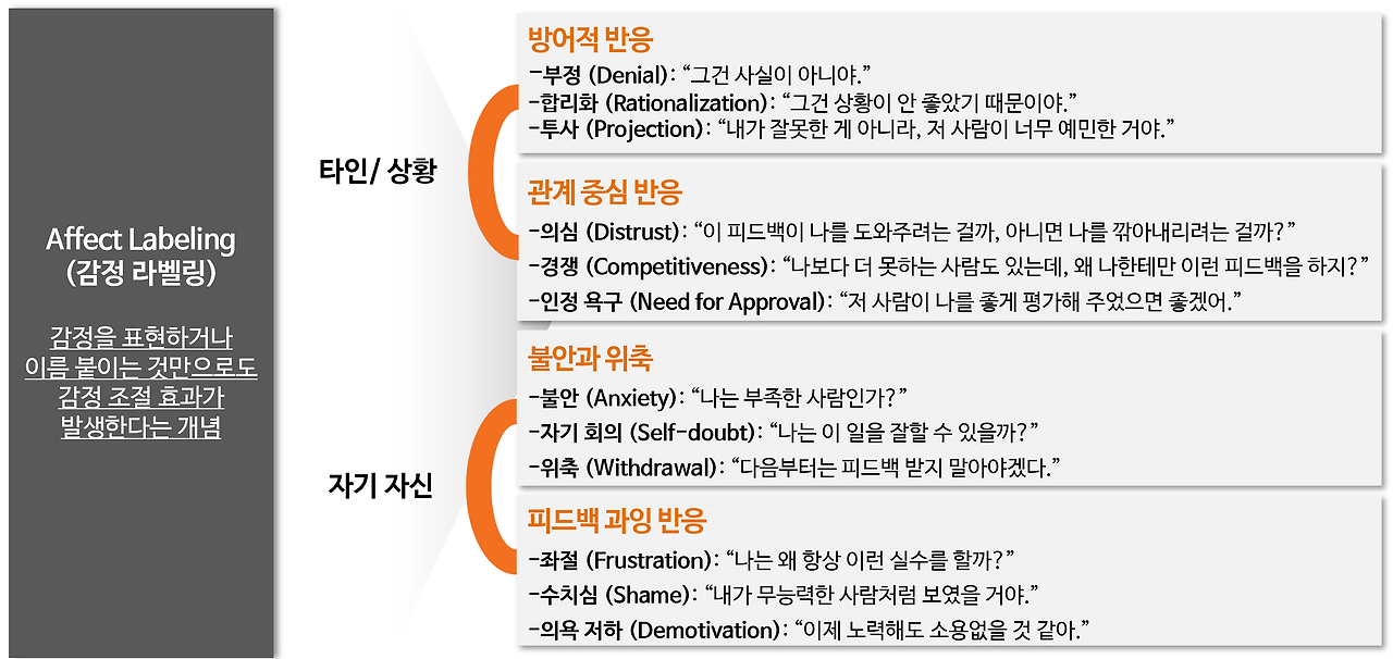먼저는 감정을 이해하고 조절하는 과정이다. 피드백을 들었을 때 즉각적으로 반응하기 보다, 생각하는 시간을 가지는 것이다. 이 피드백 안에 나에게 도움이 되는 내용이 있을 수 있다는 사실을 상기하면서, 스스로의 생각을 리프레이밍 해 보는 시간이라고 할 수 있다.