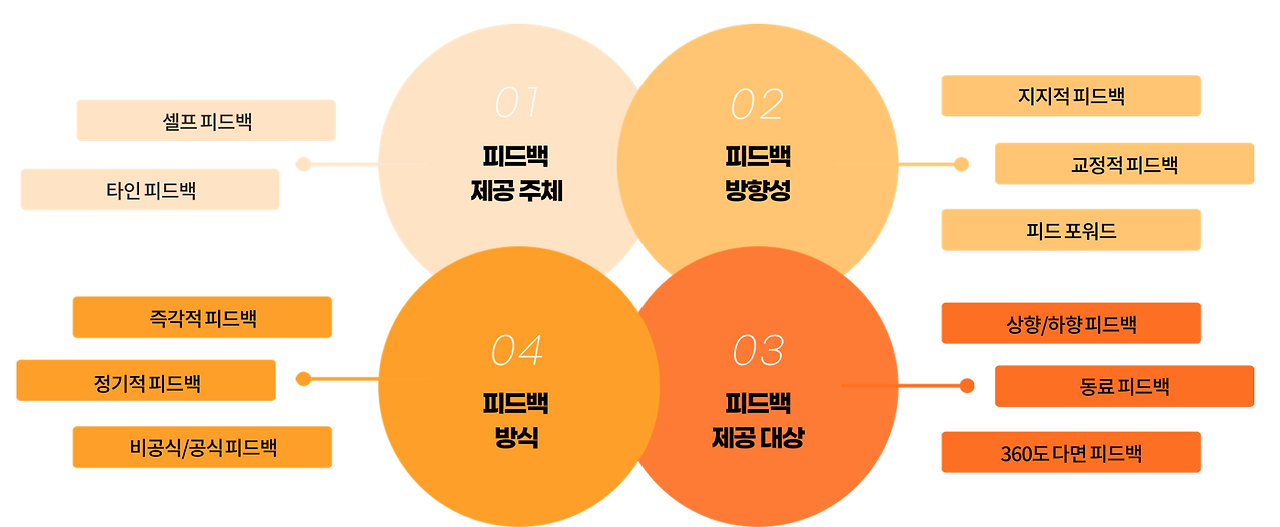 분류기준이 무엇인지에 따라서도 피드백의 종류는 굉장히 다양하다. 피드백 제공의 주체가 누구인지에 따라, 셀프 피드백이 되거나 타인 피드백이 되기도 한다. 또 피드백의 방향성에 따라 긍정적 측면을 강화하는 지지적 피드백을 줄 수도 있고, 행동을 교정하기 위한 교정적 피드백을 줄 수도 있으며, 앞으로 어떻게 해 나갈지에 대한 피드 포워드를 줄 수도 있게된다. 피드백 제공 대상에 따라서는 상/하향/동료 피드백 또는 이 모든 것을 아우르는 360도 다면 피드백으로 구분하여 이야기 할 수 있고, 피드백 방식이나 시점에 따라 즉각적 피드백인지, 정기적 피드백인지, 공식적 피드백인지를 구분할 수 있다.
