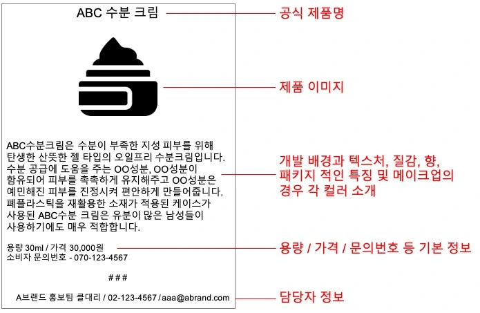 이전 편에서도 간단하게 설명했지만 외국계 브랜드는 미국, 유럽 등 본사 (Head Quarter, HQ로 부름)에서 보내준 영문 자료를 번역해 국문화한닼 국내 브랜드는 확인할 수 있는 제품 정보와 마케팅 포인트를 녹여내어 자료화하고. 예를 들어 대부분의 제품 자료는 아래와 같은 구성으로 만들어진다.