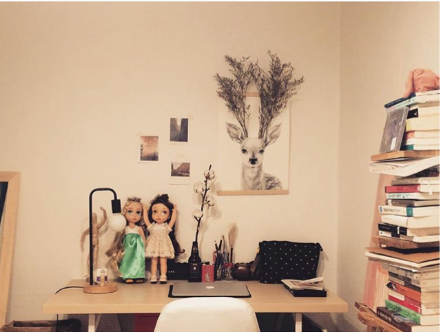 나는 데스크톱을 부모님 집에 두고 왔고, 맥북을 사용하고 있었기 때문에 책상을 훨씬 넓고 깨끗하게 쓸 수 있었는데, 밤마다 글을 쓰거나 책을 읽을 때 필요한 무드등도 하나 함께 구매했다. 그 밖에 좋아하는 사진이나 엽서를 마스킹 테이프로 대충 붙이고 좋아하는 꽃(미스티 블루, 목화)로 장식을 했다. 책상 위에 달린 사슴 그림은 1200M 에서 샀는데 사슴 머리 쪽에 드라이플라워를 꼽을 수 있게끔 잘라져 있어서 예쁜 인테리어 소품으로 활용할 수 있다.