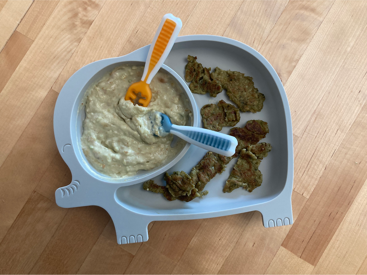 - 팬케익 (이전에 만들어줬던 팬케익 반죽을 1회 분량씩 얼려두어서 전자렌지 돌려서 녹인 후 팬에 구워서 줬다) : 바나나, 오트밀가루, 케일 갈은것을 후라이팬에서 오일을 살짝 두른뒤 구워서 준다