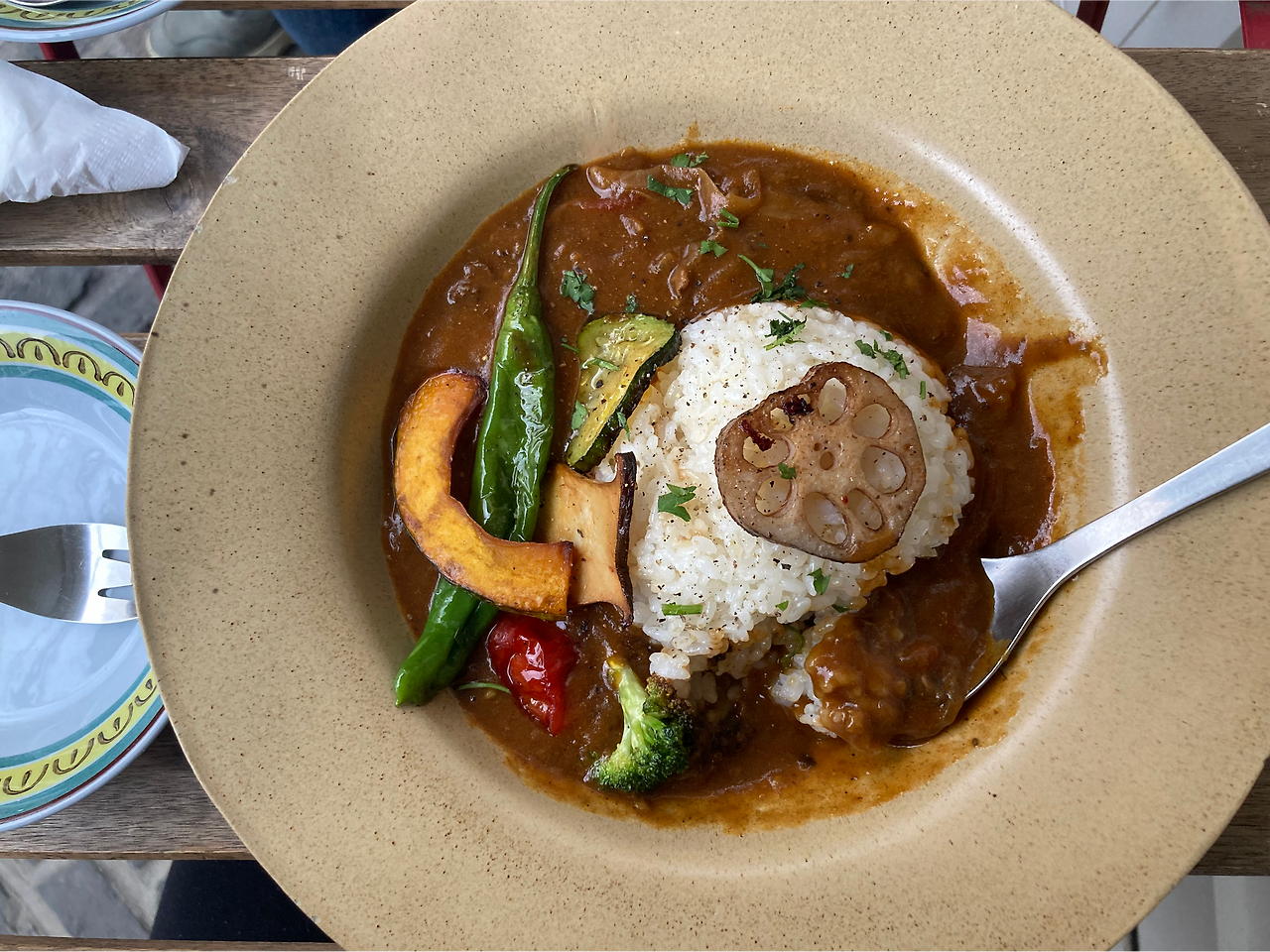 그동안 집에서 충실히 차리고 먹고 먹이고 치우는 일상에서 조금 벗어나고 싶어서 외식을 하기로 했다. 집 근처에 있는 식당에서 비프커리를 시켰다. 구워진 채소 하나하나 맛을 느껴가며 먹을 수 있어서 좋았다. 한그릇 음식이 좋아서 냉동실에 있는 소고기로 이번주엔 비프커리를 집에서 만들어봐야지 생각했다.