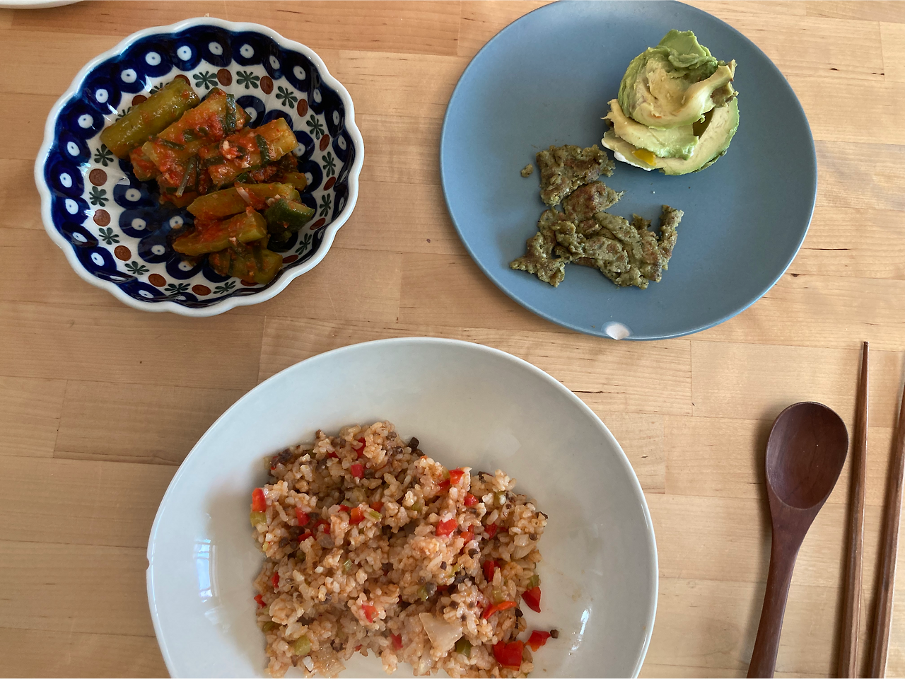 오늘은 엄마가 태오를 봐주러 오시는 날이다. 그래서 덕분에 점심으로 엄마가 만든 소고기 파프리카 볶음밥, 오이김치를 먹었다. 오른쪽 위에는 태오 점심에 준 오트밀 팬케익과 아보카도 자투리 남은거다ㅎㅎ 양이 너무 많아서 내가 후식으로 먹으려고 담았다.