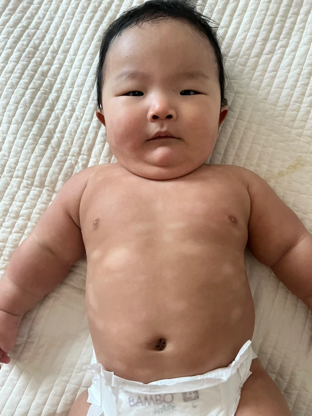 몸통에는 별다른 반응이 보이지 않는다. 흰 점? 같이 얼룩져 보이는건 아토피 피부 반응이 올라와서 피부 각질이 올라와 벗겨진 후 새 살이 나와 희게 보이는 거다. 피부가 회복중인거다! 또 붉은 아토피 반응이 다시 오지 않기를...! 원인이 되는 음식을 찾아야 할텐데 아직 이렇다할 원인 음식을 못찾은 것 같아 답답하기는 하지만, 이전처럼 피부가 뒤집어지지 않아 다행이다.