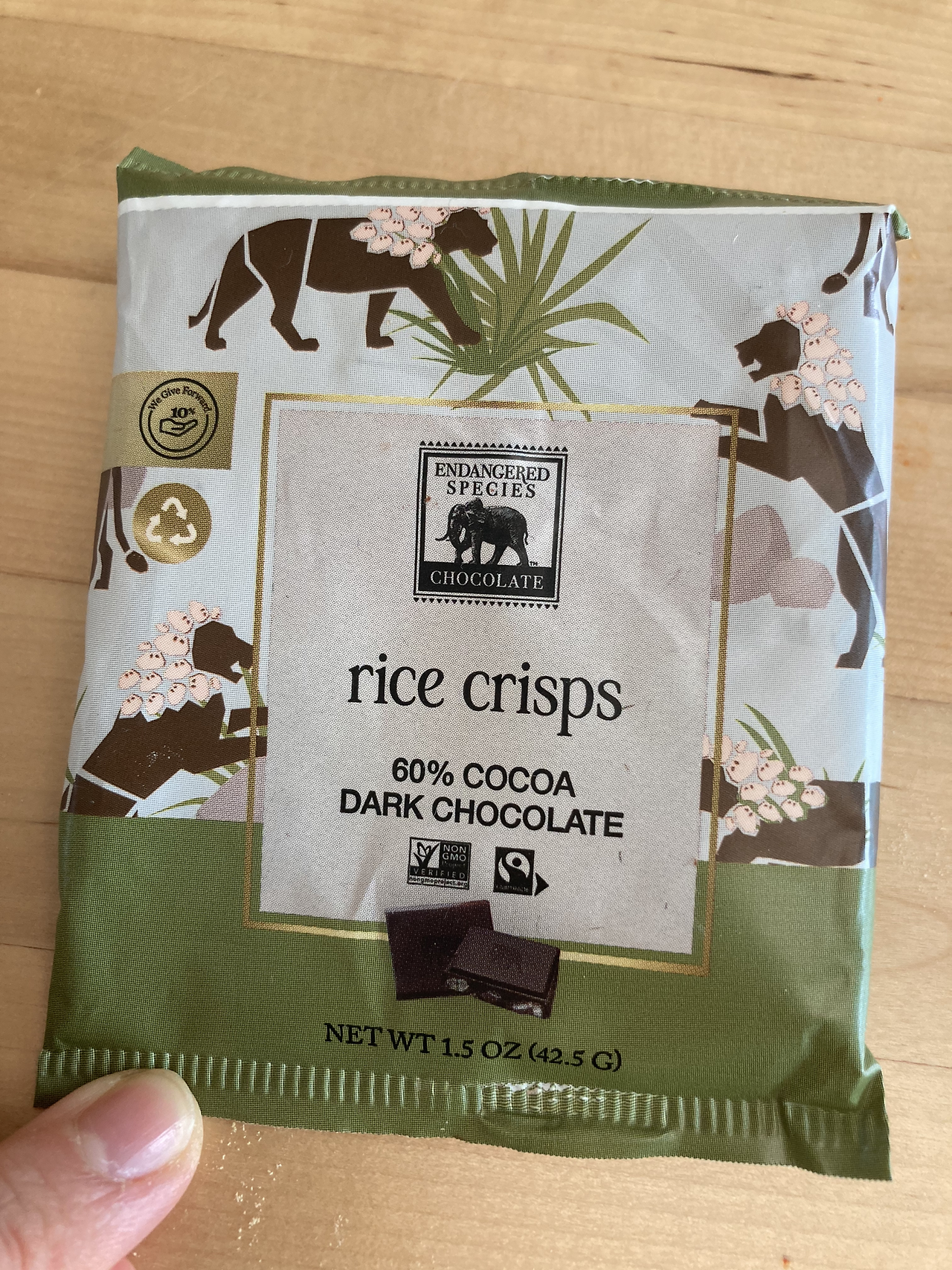 endangered species 라는 브랜드의 다크초콜릿을 아이허브에서 주문해서 먹는데 그중에서 내 최애 초콜릿이다. 크런키 초콜릿 처럼 쌀로 만든 과자? 같은게 들어있어서 씹는 맛도 있고 작아서 가지고 다니기에 좋다.