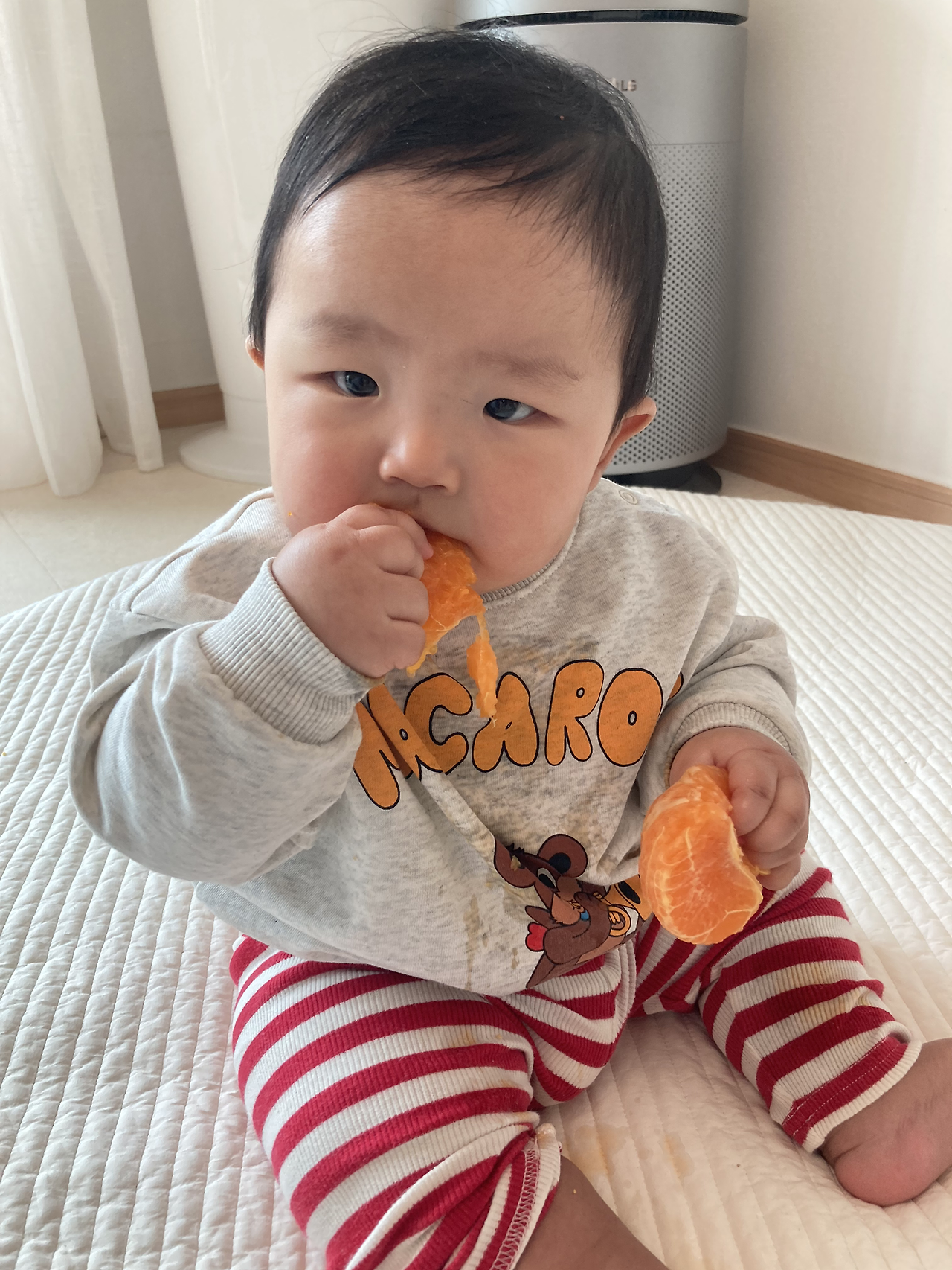 천혜향을 잘 씻어서 공 대신 가지고 놀게 했더니 당연히 입으로 가져갔다. 이빨이 있으니 깨물려고 하길래 까서 줬더니 즙만 쪽쪽 잘 먹다가 나중에는 꿀꺽 삼켰다. 즙 빨아먹고 손으로 움켜쥐고 하느라 옷이 다 천혜향 국물 천지인데 놀이로 생각하고 냅뒀다. 나는 음식을 사랑하는 사람이고 태오 역시 그랬으면 하는 마음이라 음식 만지고 노는것엔 관대한것 같다. 또 왠만한 플라스틱 장난감 보단 물고 빨고 만지고 하기에 더 좋다고 생각한다.