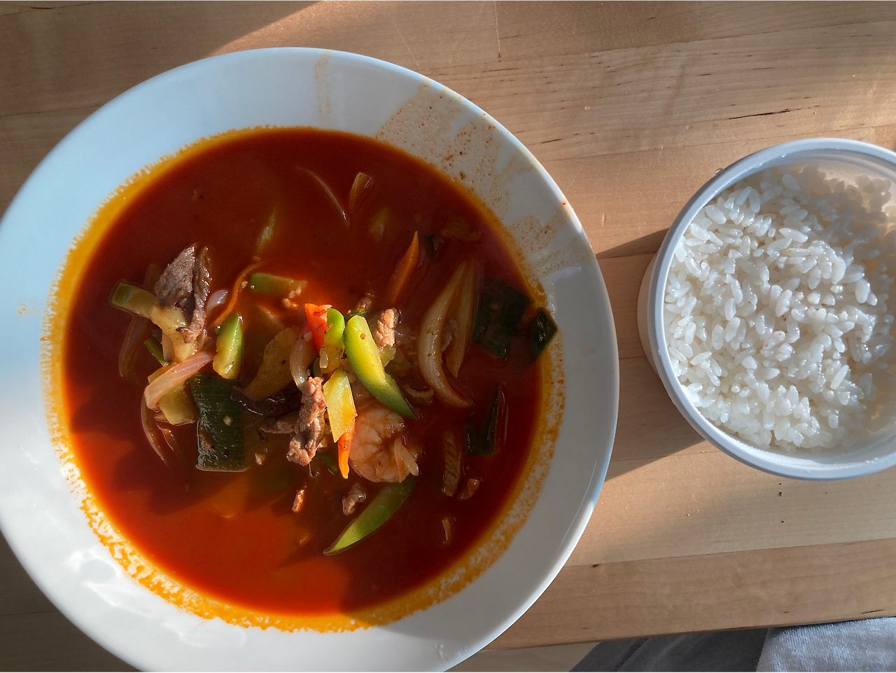 여행때 먹일 이유식을 만들고 짐을 챙기느라 정신이 없어서 저녁에는 짬뽕밥을 시켰다. 오징어가 들어가길래 빼고 먹었다.