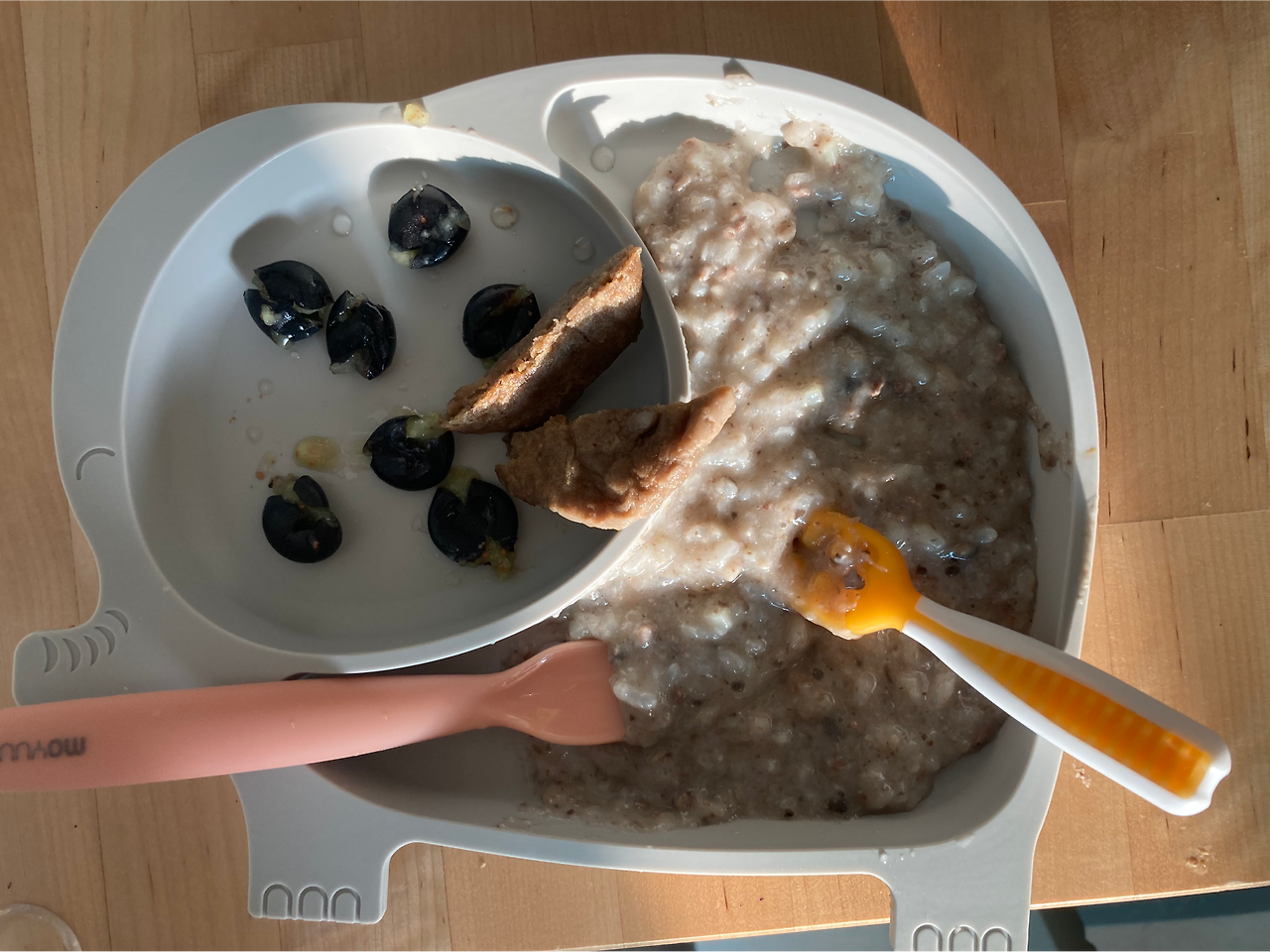 태오 이유식은 새로 만들었는데 고기파인지, 고기랑 쌀 들어간 이유식은 잘 먹는다. 그리고 유튜브를 보다가 아기 빵을 만들어 주길래 팬케익 대신 만들어본 빵. 다시 한번 만들어보고 레시피는 올릴 참이다. 태오가 잘 먹었긴 했는데 손에 쥐고 입으로 가져갈 남은 부분이 얼마 없어서 손바닥 안에 남은것들은 다 바닥에 떨어졌다. 블루베리는 그냥 주면 기도폐쇄 위험이 있어서 손가락으로 눌러서 준다.