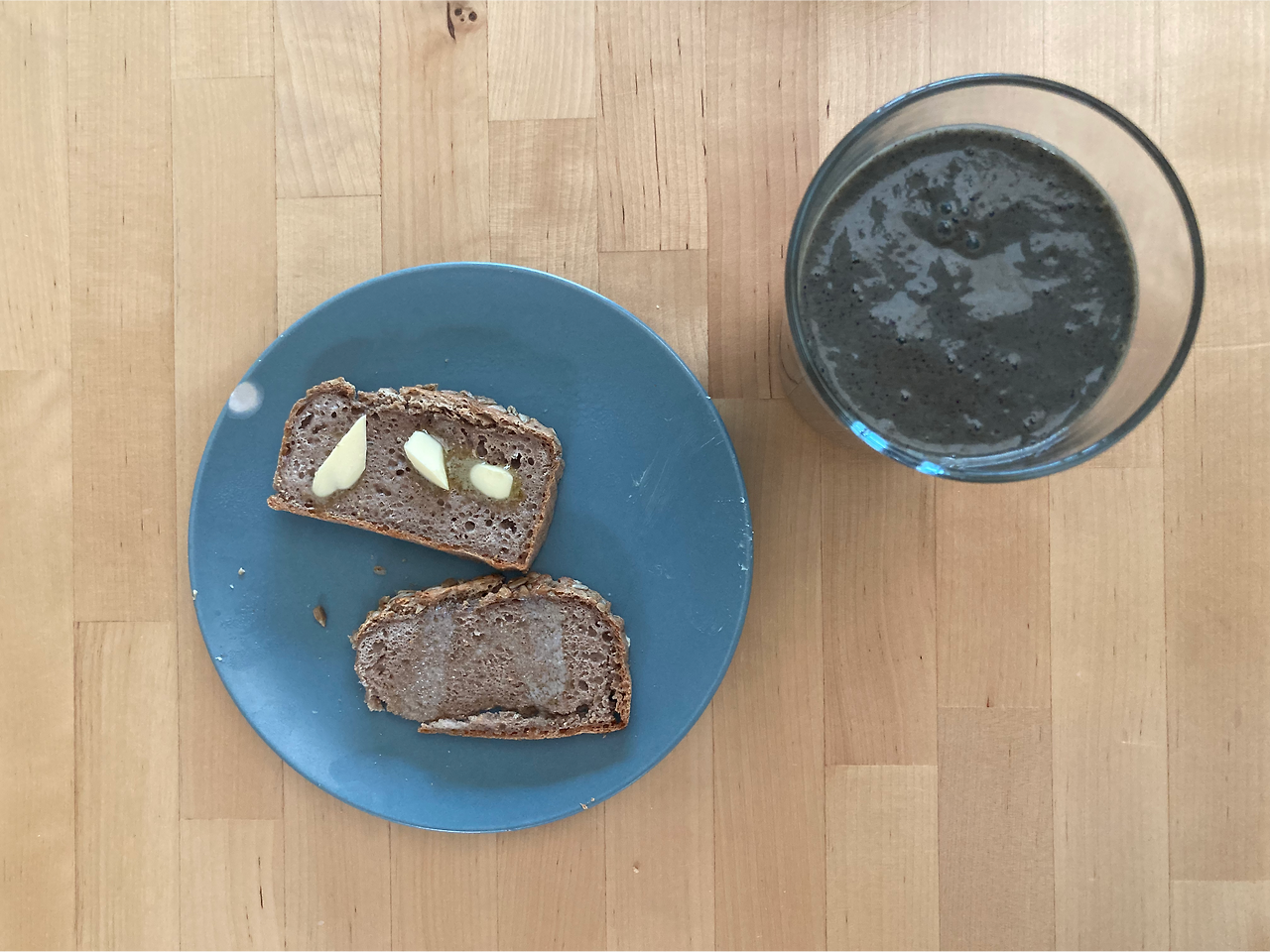 내 아침: 메밀빵, 버터, 스무디 (바나나, 케일, 셀러리, 해바라기씨 버터, 오트밀크)