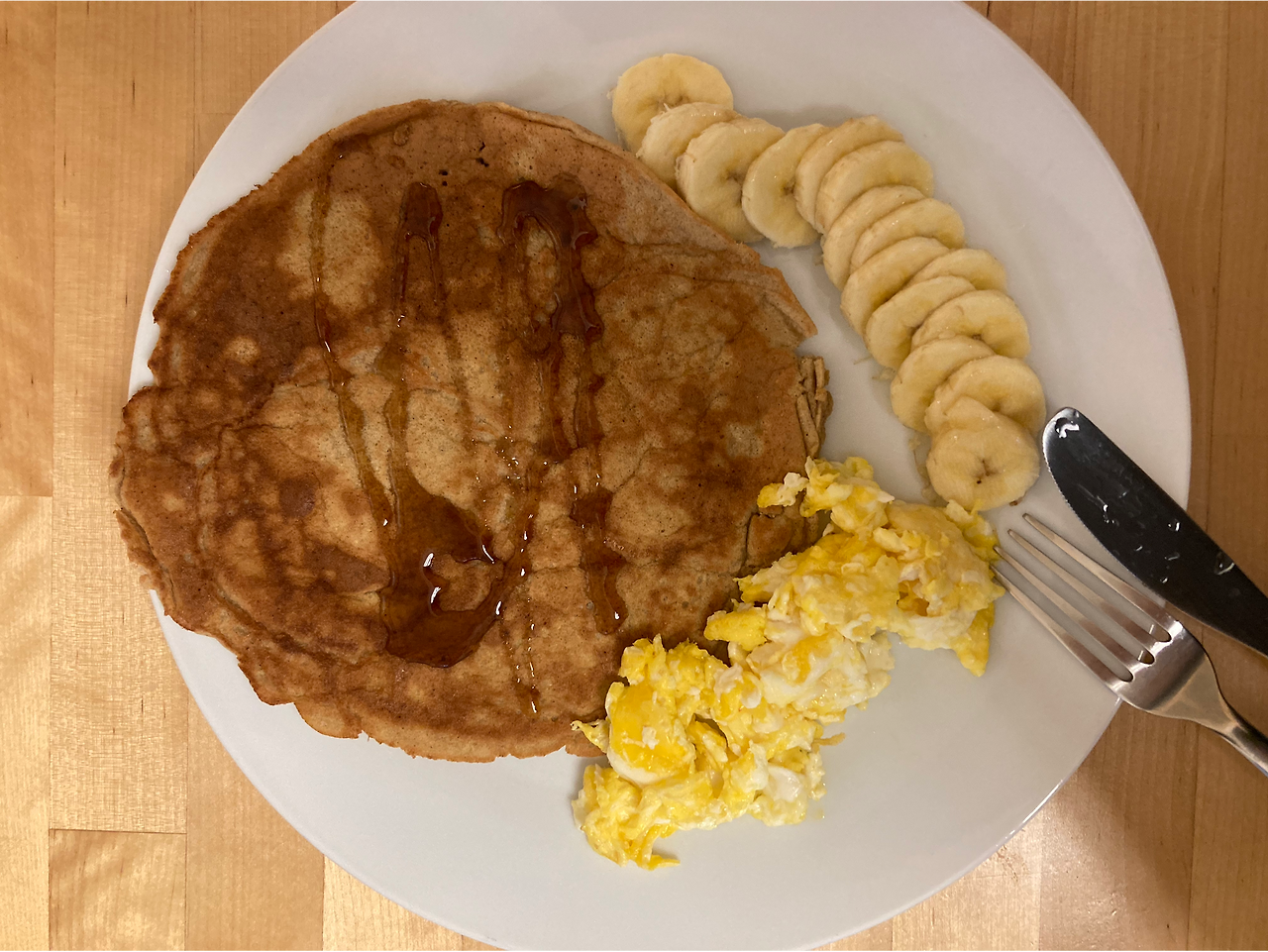 내 저녁 : 팬케익(글루텐프리 팬케익믹스, 달걀, 두유, 해바라기씨 오일), 바나나, 스크램블에그