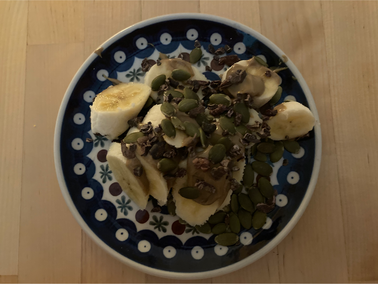 아 그리고 내 간식 : 아래는 바나나, 해바라기씨 버터, 호박씨, 카카오닙스의 조합. 디저트 스럽게 한접시 차려먹었다.