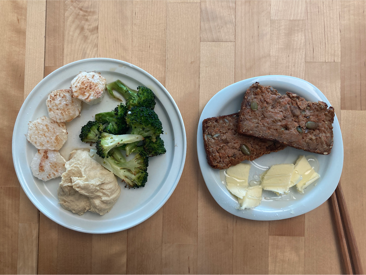 남편이랑 태오는 집들이 간 집에서 먹고 온다고 했다. 그래서 나는 만들던 마랑 브로콜리를 일부 담고, 만들어뒀던 후무스랑 함께 먹었다. 냉동실에 있던 당근케익바를 빵/후식 느낌으로 든든하게 먹었다.