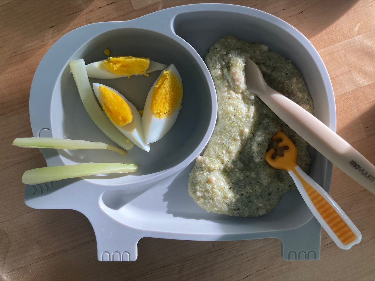 태오 저녁 : 죽(닭고기, 브로콜리 ,현미), 삶은 계란, 브로콜리 줄기 찐것