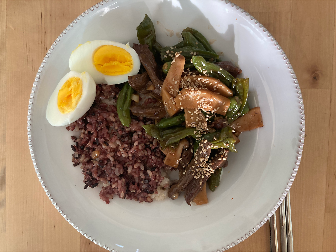 내 저녁 : 꽈리고추 소고기 덮밥, 흑미밥, 삶은달걀