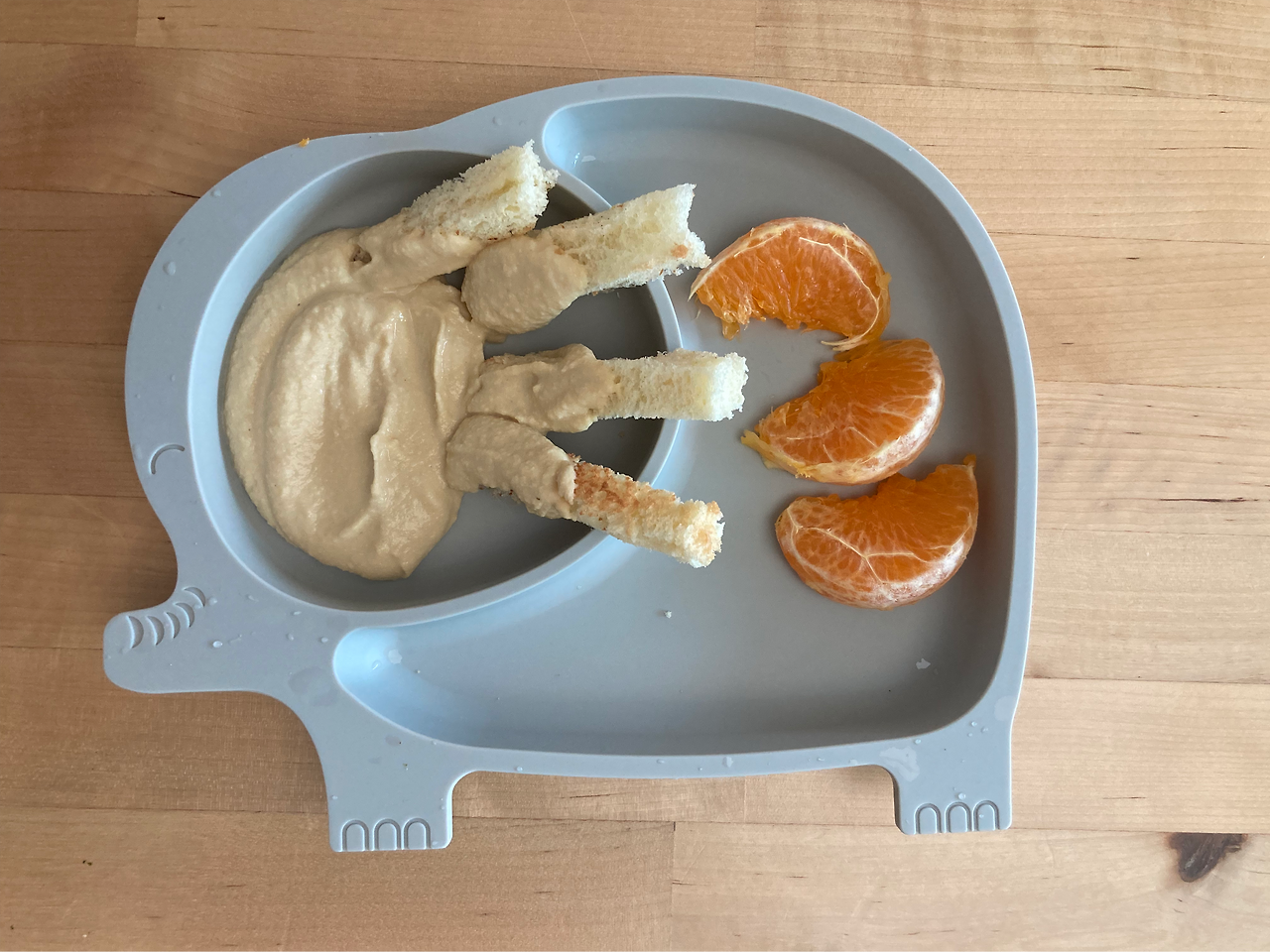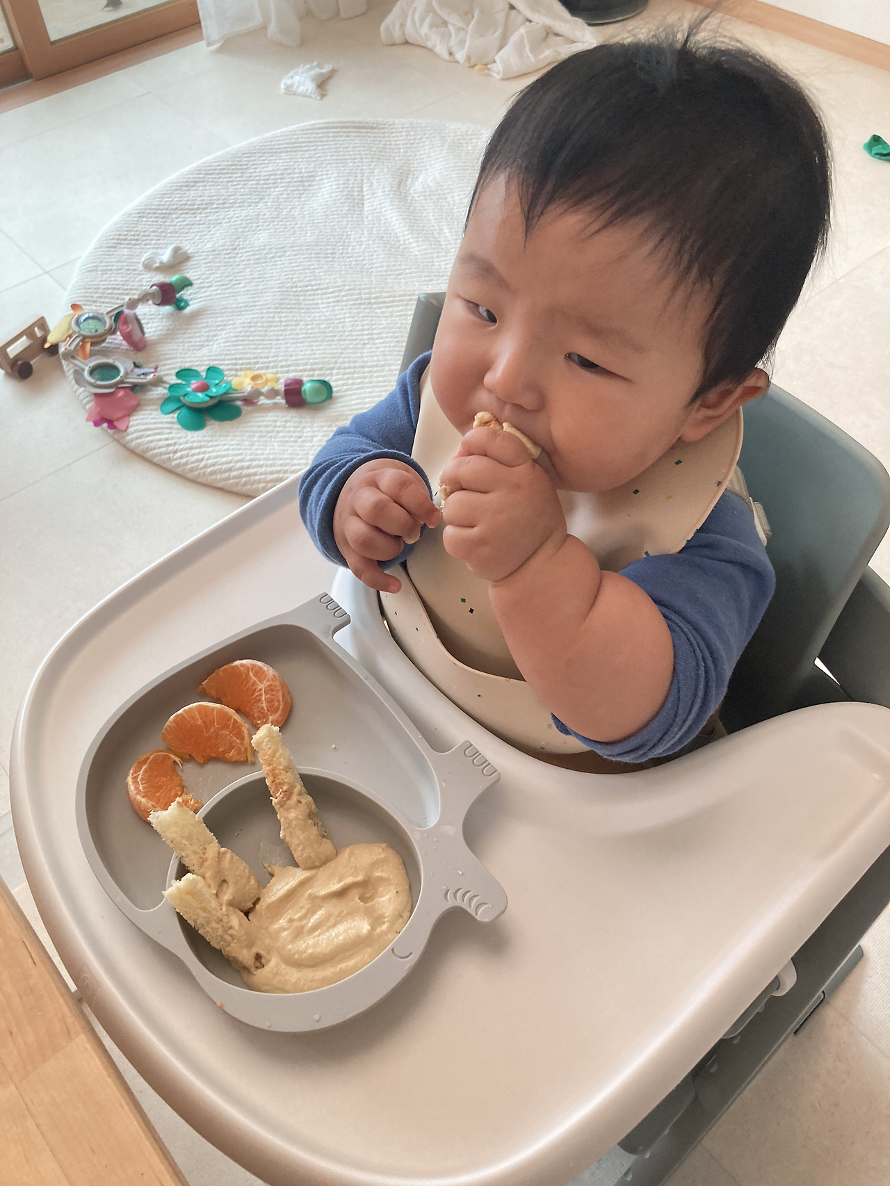 밀가루를 먹여볼 생각으로 식빵만 주기보다는 너무 퍽퍽할것 같아서 후무스를 얼른 만들어서 같이 줬다. 아기가 직접 먹는 자기주도식을 할때 빵은 적당히만 구워줘야 안전하다고 읽었다. 너무 부드러워도 떡 처럼 뭉쳐소 목에 걸릴 수 있고 너무 바삭하게 구워도 먹기 힘들어한다고 해서 적당히 구운뒤 까슬한 부분을 제거하고 스틱처럼 자른뒤 후무스를 발랐다. 천혜향 역시 껍질이 좀 두꺼워서 삼키는데 힘들어 하길래 껍질을 일부 제거한뒤 줬다.